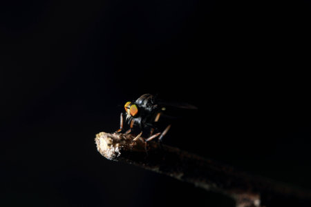 A closeup macro photograph of a house fly, an arthropod insect organism with wings. This invertebrate is a pollinator but can also be considered a pest on a black background