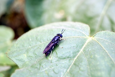 a small black fly with body wings and big eyes and antenna in clear sharp focus resting upon a leaf in the forest in spring day light