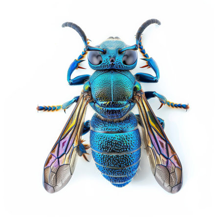 A close-up of a metallic blue cuckoo wasp with intricate details, isolated on white background