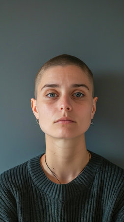 A woman with a very short haircut is dressed in a black sweater and making eye contact with the camera