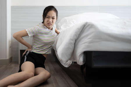 Unhappy asian child girl fell from her bed to the floor, suffering from back pain, sore buttocks, sad woman holding hip with her hand,she fell out of bed while sleeping,accident and injury in the home