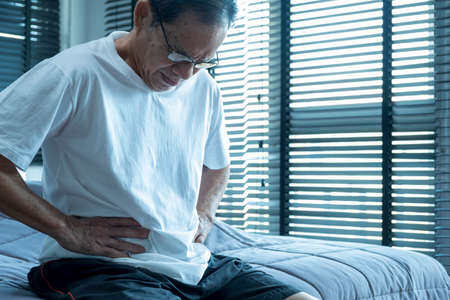 Asian Elderly man Stomachache in bedroom.