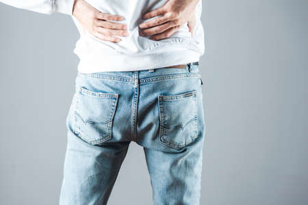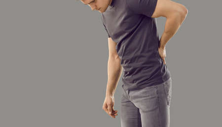 Young man suffering from back pain due to large physical exertion isolated on gray background. Cropped image of unhappy man in jeans and T-shirt holding his back standing near copy space. Banner.