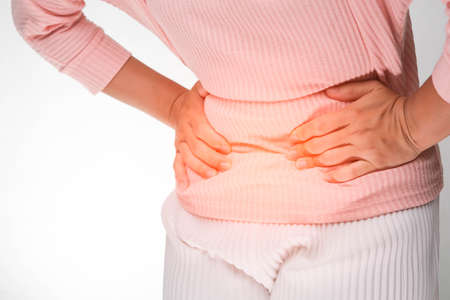 Close up hand of aging woman touching her waist. Lower back pain. herniated disc