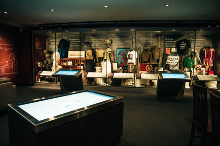 Brussels, Belgium - August 17, 2019: Uniform patches on a jacket in the War, Occupation, Liberation new permanent collection The Royal Museum of the Armed Forces and Military History in Brussels.