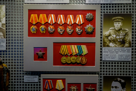 BELARUS, MINSK - MAY 01, 2018: Indoor view of assorted medals inside of belarusian state Museum of the Great Patriotic War, after restoration of many exhibits