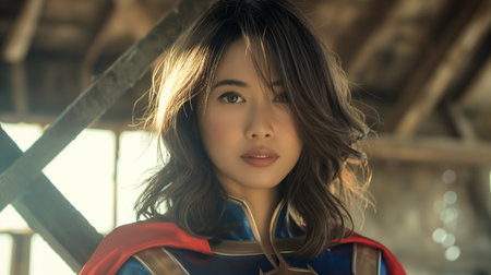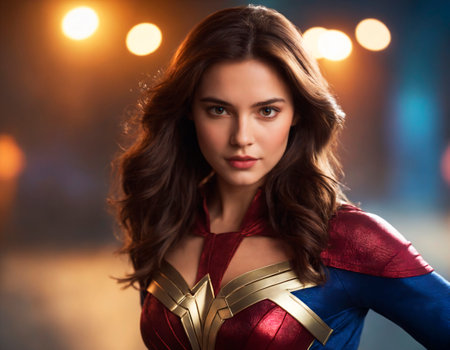 A confident young woman embodies a superhero in a dramatic, illuminated urban setting