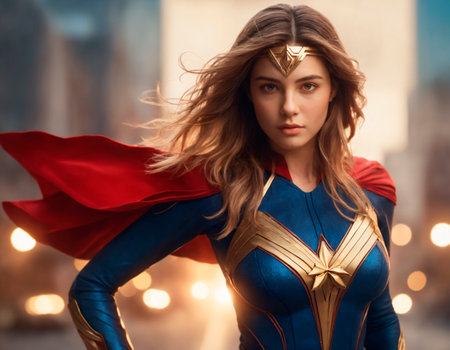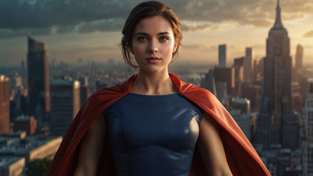 A confident female superhero stands ready for action in a bustling urban setting during golden hour, showing her vibrant costume and cape.