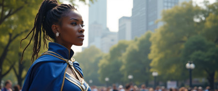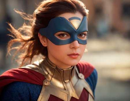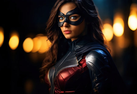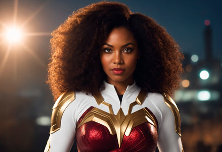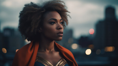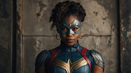 An empowered African American woman, dressed as a superhero. She wears a vibrant costume adorned with a striking mask, exuding strength and determination.