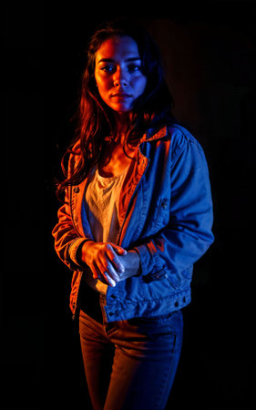 photo of beautiful woman with mixed red and blue lighting , generative AI