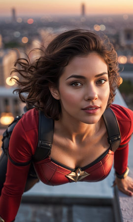 A woman in a red superhero costume stands confidently on a rooftop at sunset, with a city skyline behind her. The scene conveys a sense of empowerment and readiness.