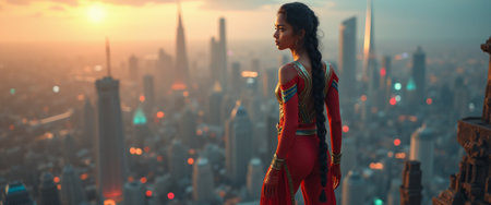 Heroic woman in a stunning superhero costume overlooking a city skyline