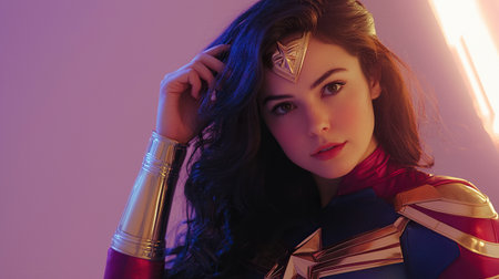 A powerful female superhero strikes a fierce pose in a bustling city as sunlight glimmers off her costume. She prepares for action, embodying strength and determination against a modern backdrop