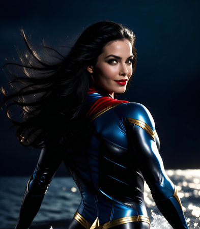 The woman is a superhero. A beautiful female superhero in a fantastic costume.