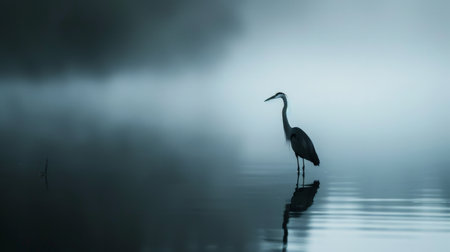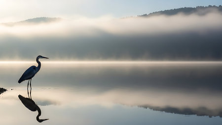 A lone heron stands in a misty lake, its reflection mirroring the ethereal atmosphere.