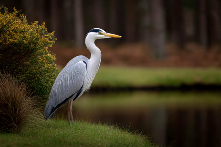 Gray heron standing in tranquil pond reflection generated by artificial intelligence generated by artificial intelligence