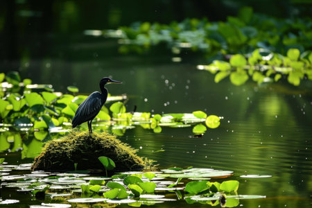A majestic heron stalks fish in a vibrant, restored wetland at sunset This stunning image embodies wildlife sustainability and ecosystem protection The heron's hunt highlights the delicate balance of a thriving habitat, showcasing the success of conservation efforts and the importance of wetland biodiversity AI Generative