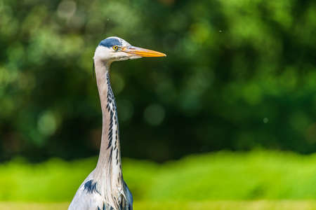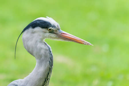 Portrait of a young Grey Heron (ardea cinerea) with traces of down on its beak from preening, London, England, UK