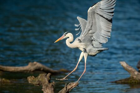 A Grey Heron (Ardea cinerea) landing on a wood in the water
