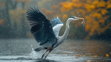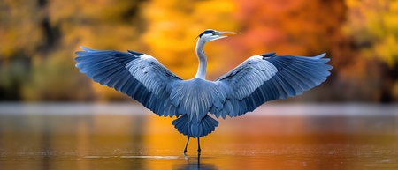A majestic heron spreads its wings wide while standing in a calm lake, with vibrant autumn colors in the background