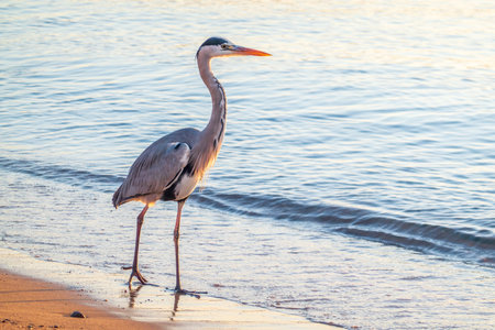 a beautiful blue heron gracefully stands in the water, captured in the style of evocative environmental portraits reminiscent of whistlerian and national geographic photography. the image showcases the heron's elegance against a backdrop of organic stone carvings, reminiscent of the works of david nordahl. the color palette of orange and gray adds a captivating touch to this creative commons attribution photo. ai generated