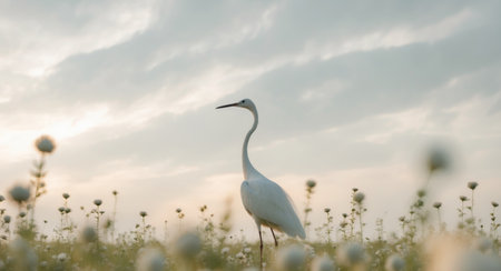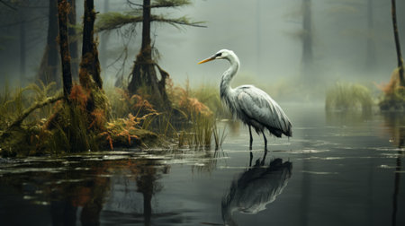 a young white heron gracefully stands in the misty waters of a swamp, captured in a sketchfab-style illustration. this hyper-realistic depiction of the heron showcases the revival of historic art forms, reminiscent of the hudson river school's stunning animal depictions. the cryengine technology brings this scene to life, immersing viewers in the beauty of nature. ai generated