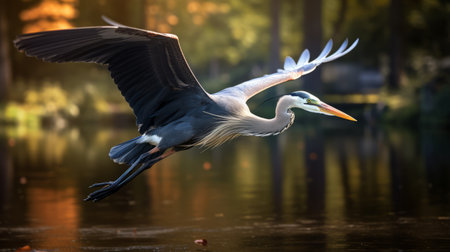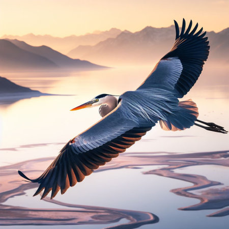 a heron gracefully soars above the shimmering water, captured in stunning detail through vray tracing. this environmental portrait showcases the majestic bird amidst a backdrop of cryptid academia. the backlit photography technique enhances its ethereal beauty, while the 32k uhd resolution brings out every intricate detail. the color palette of light orange and gray, complemented by hints of blue, adds a touch of serenity to