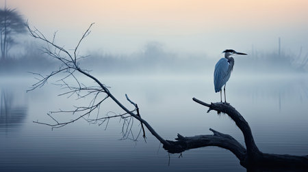 Majestic heron standing in serene misty wetlands at sunrise. That the image is generated using AI.