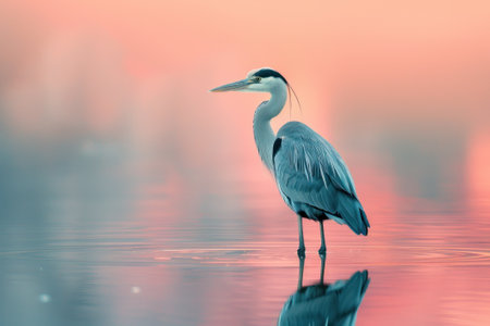 A great blue heron stands in the shallow water of a misty marsh at sunrise. The warm light of the rising sun illuminates the fog and creates a beautiful reflection of the heron in the water.