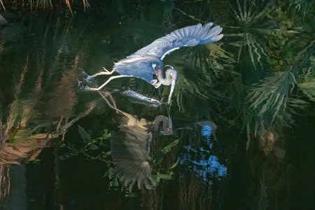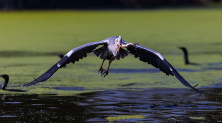 Great Blue Heron (Ardea herodias) landing on a swamp