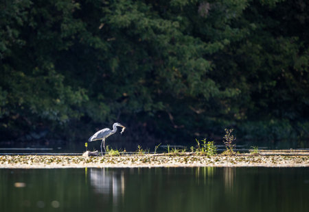 Grey heron bird (ardea cinerea) standing on river island and holding fish in beak on sunny morning with forest in background. Wildlife in natural habitat