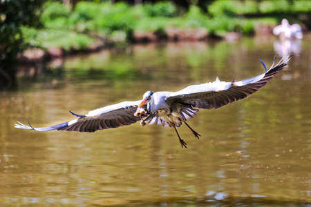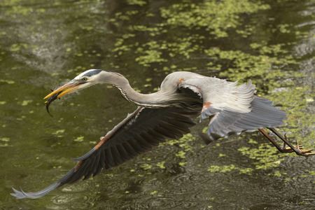 Great blue heron, Ardea herodias, flying low over a pond at Corkscrew Swamp in the Florida everglades with a bullhead catfish in its bill.