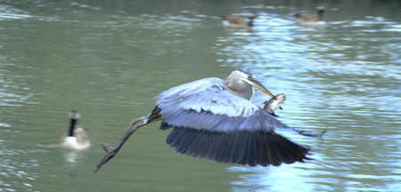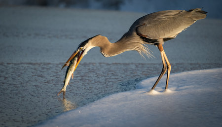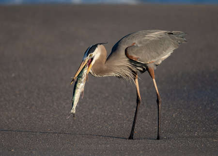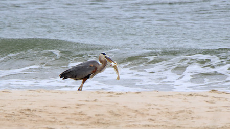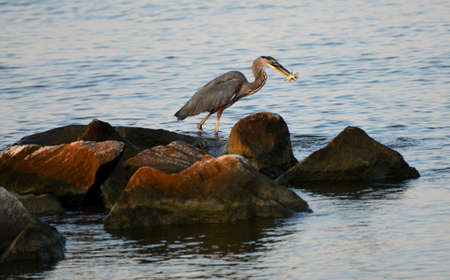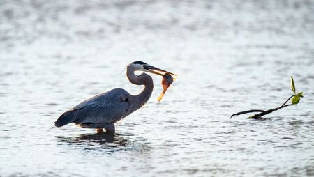 A Great Blue Heron catches a fish on the Chesapeake Bay in Maryland