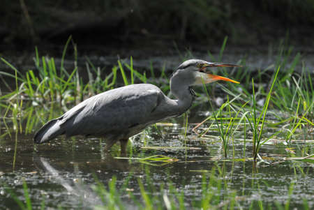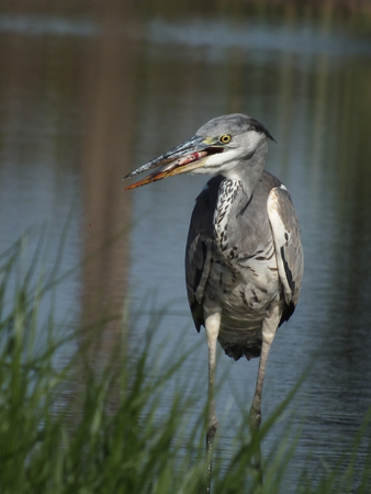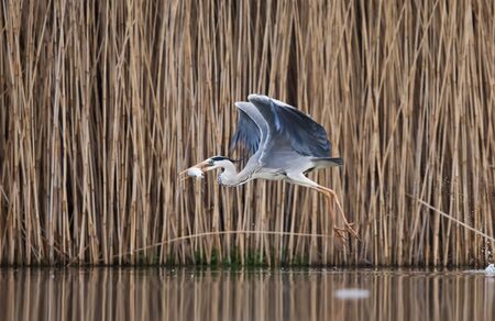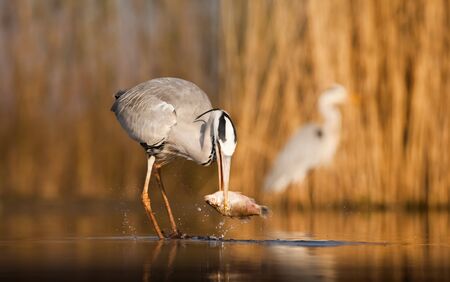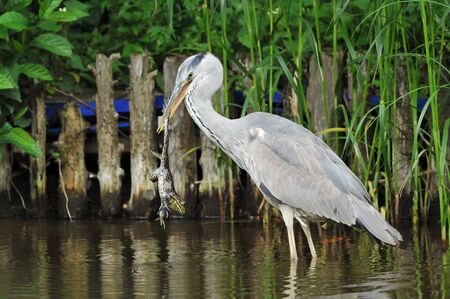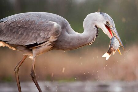 Grey heron Ardea cinerea long legged predatory wading bird heron fishing eating bird. High quality photo