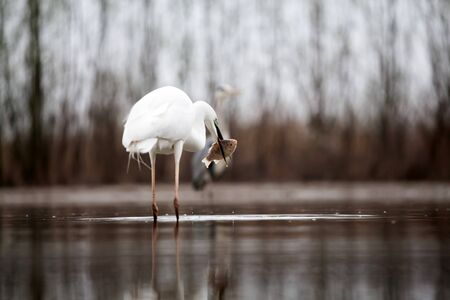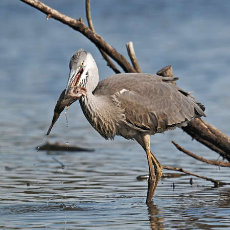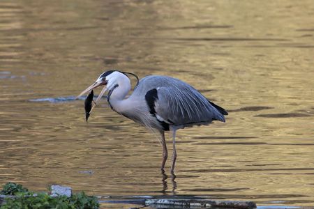 Grey heron (Ardea cinerea) wading in a lake with a fish in its beak