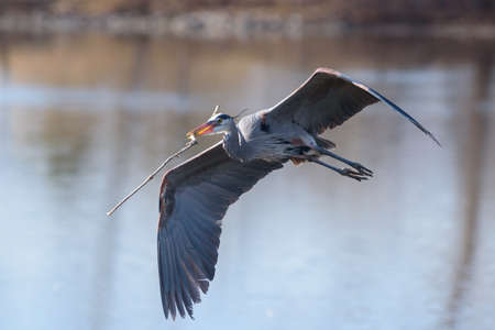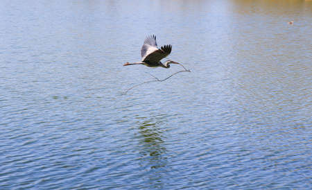 Closeup of a gray heron flying above the water and holding a dry branch in its beak