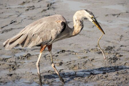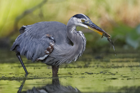 A Great blue heron feeding upon an eel in a coastal wetland.