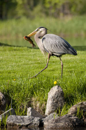 Great Blue Heron (Ardea herodias) eating a green frog at the edge of a river - Ontario, Canada