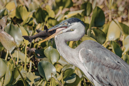 Portrait of Great blue heron (Ardea herodias) eating fish