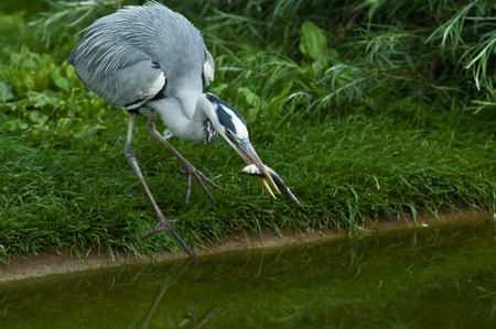 A Grey Heron catches a fish in a pool in Staffordshire, England.