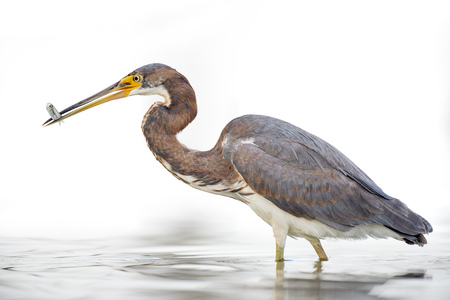 A juvenile Tri-colored Heron stands in shallow water with a small minnow it just caught in its beak with a solid white background.
