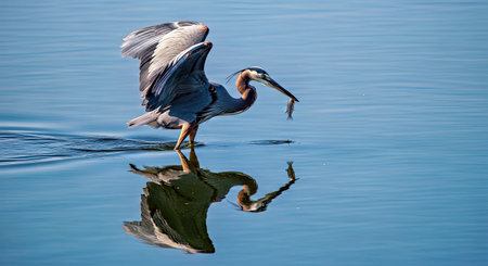Elegant Blue Heron Reflection Calm Blue Water Fishing Wildlife Bird Scene