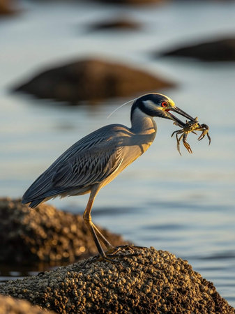 Black-crowned Night Heron (Nycticorax nycticorax) with a crab in its beak