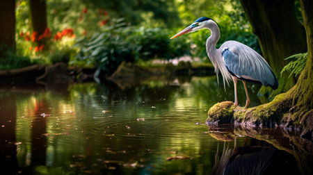 AI Generated. Blue heron wading in a tranquil pond amidst lush foliage