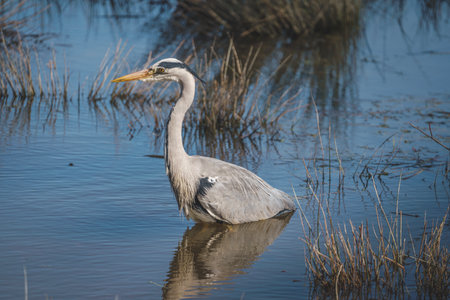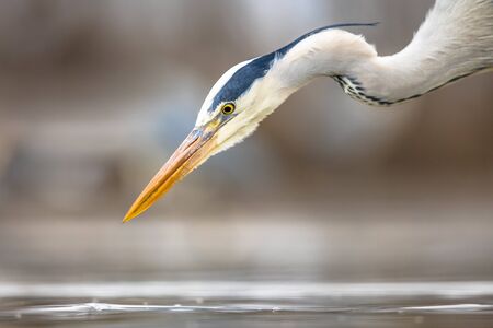 Close-up of a gray heron (Ardea cinerea) hunting in water, patiently waiting to catch prey in its natural habitat