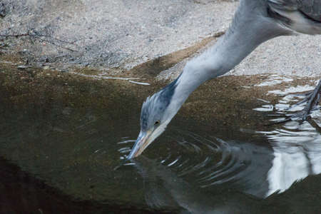 Close up view of a grey heron drinking water at pond.