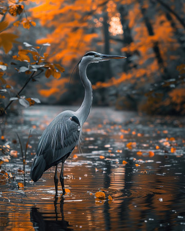 Heron stands gracefully in calm water surrounded by golden autumn leaves, reflecting serene fall scenery. ideal for nature-themed prints, showcasing elegance and the peaceful essence of seasonal transition. Generative AI
