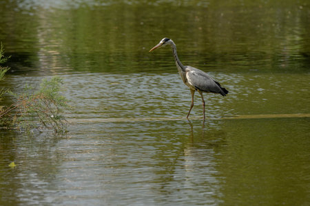 Gray heron hunts for fish in the lake in the evening