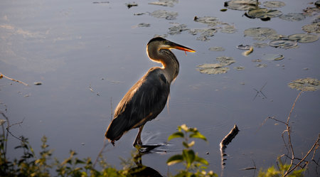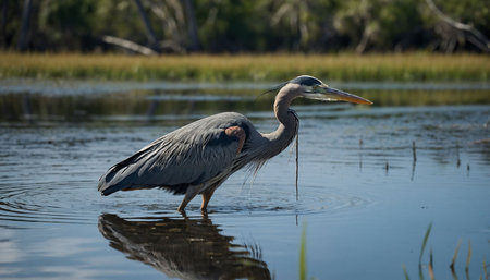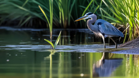 Majestic heron waiting in shallow pond embodying patience and strength