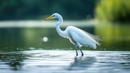 A majestic white heron wades through calm waters, embodying the essence of tranquility and grace as it hunts for fish amidst a peaceful natural backdrop.
